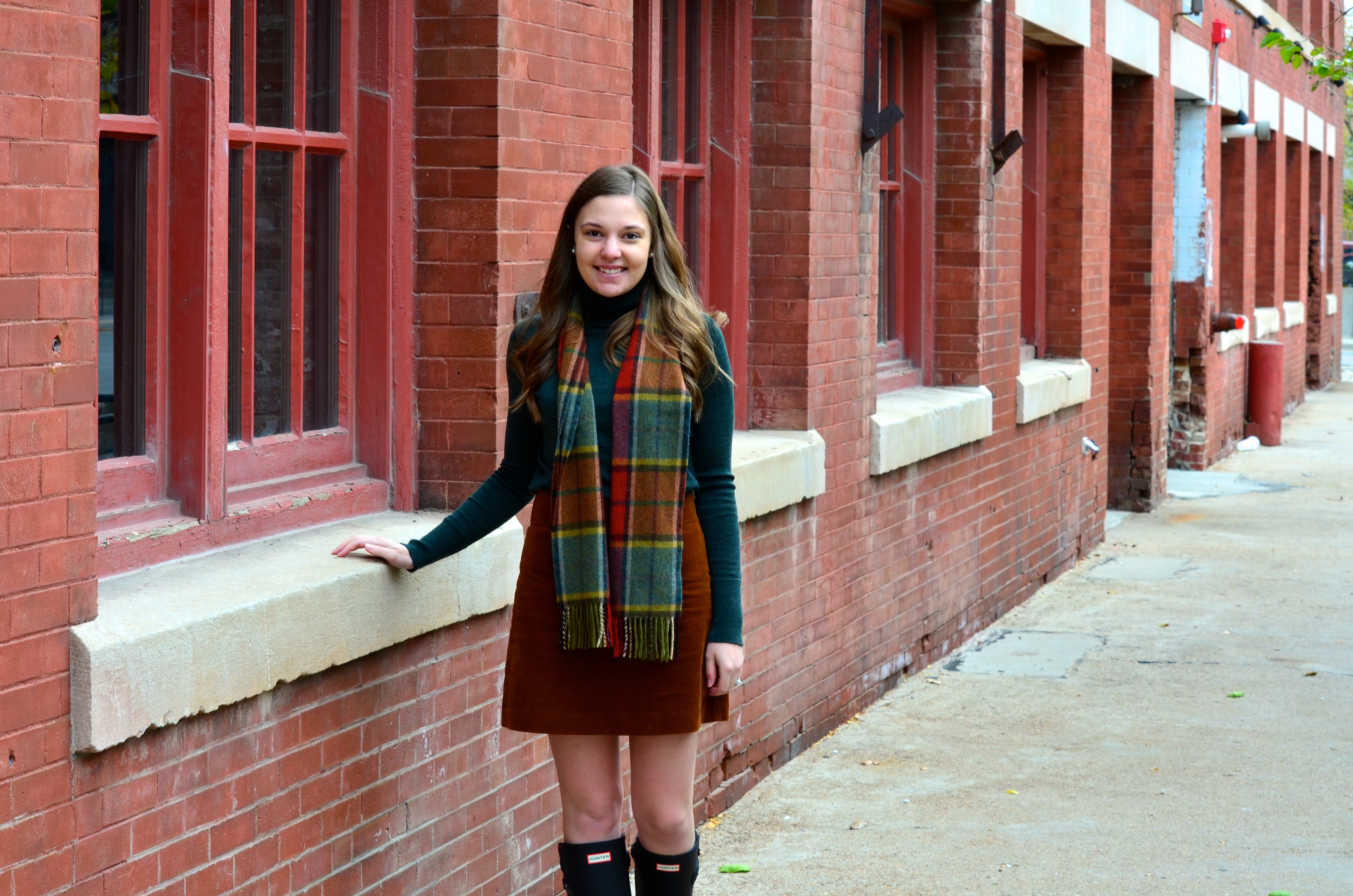 Green Turtleneck, Corduroy Skirt, Hunter Boots_1500