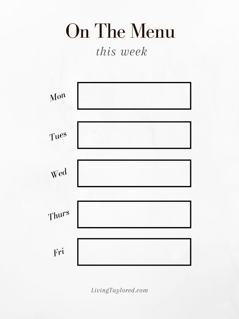 Below I’m sharing my weekly menu doc (to download as a PDF click here). I fill it out each Saturday in preparation for the week ahead. Taking time to write out our menu each week helps me stick to it. I hope it will be helpful for you too. If you have any questions to help you with your own meal planning goals feel free to comment below. For weekly meal inspiration follow along on Instagram and keep an eye out for more weekly menu ideas here on the blog!