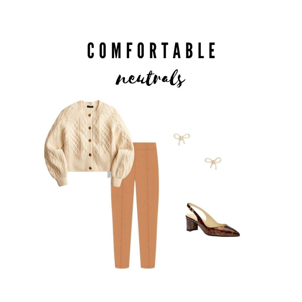 This outfit is great if you want to be super comfortable but still look put together. A cozy cardigan paired with suede leggings, the perfect slingback and simple earings.