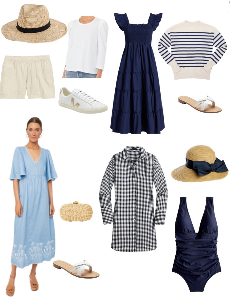 Hat | Puff Sleeve Shirt | Linen Shorts| Sneakers | Navy Dress | Striped Sweater | Chambray Dress | Clutch | Sandals | Beach Shirt (similar here) | Bow Hat | Swimsuit