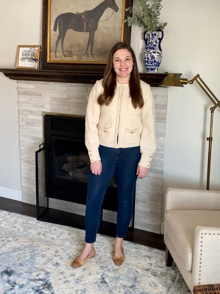 I personally have the three jackets along the left, and a cardigan very similar to the solid cream jacket. Having a structured cardigan or tweed jacket is an easy closet staple that can make the simplest of outfits look well put together. I wear some variation of this outfit once a week, sometimes more. Some of these jackets and sweater would even work paired with a simple pair of white leather sneakers for a more casual look, like these or these.