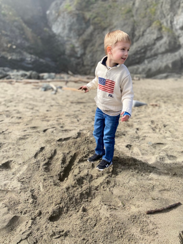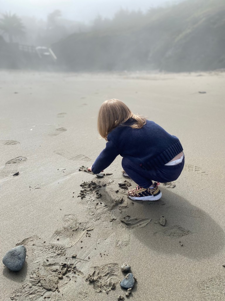 Next we headed for the beach. Even though it wasn’t “beach weather” we took a morning walk along China Beach in San Francisco. I looked up quite a few beaches before deciding on China Beach. I wanted something that was easily accessible (many have long walks or a hike down the the beach), had a view of the Golden Gate Bridge, and was kid friendly. While it was too foggy to see the bridge, China Beach was a great spot. It’s not a beach that is recommended for swimming as the current and tide tends to be too strong but during low tide it is lovely for beach walks and searching for marine life. We saw crabs, anemones, mollusks, and clams.