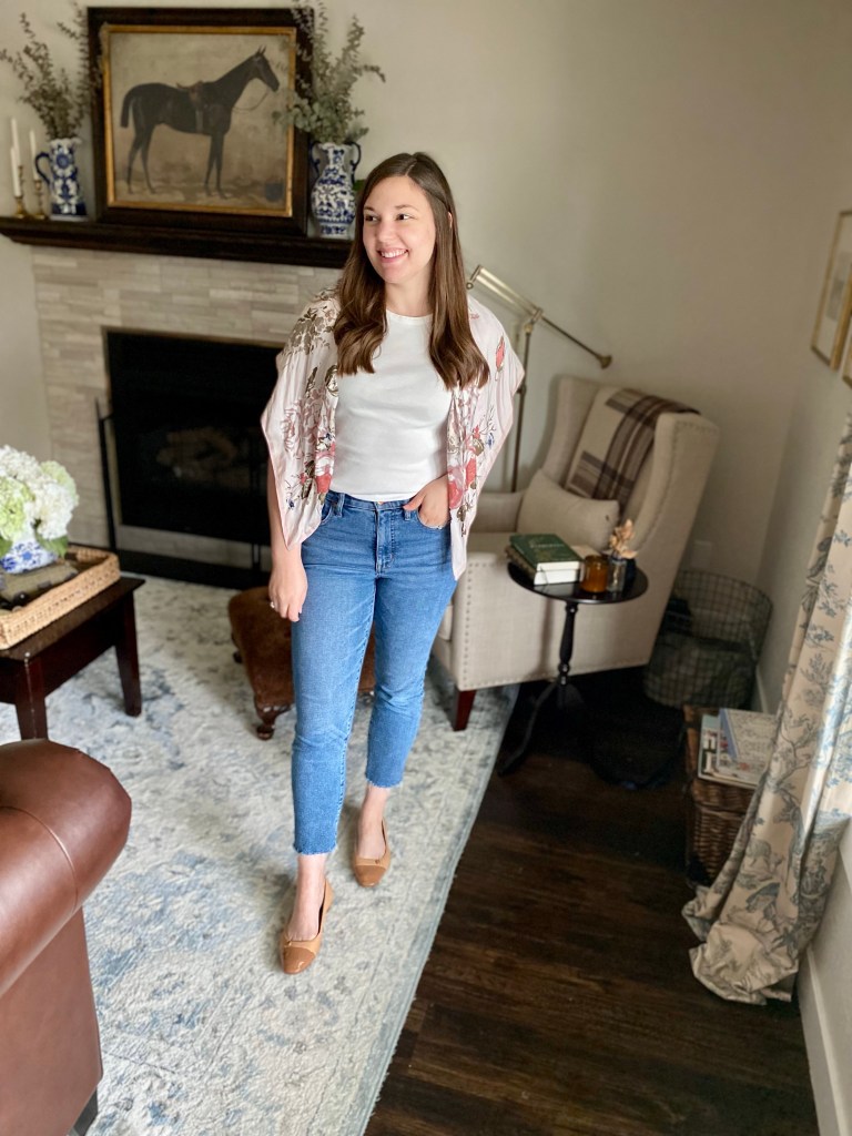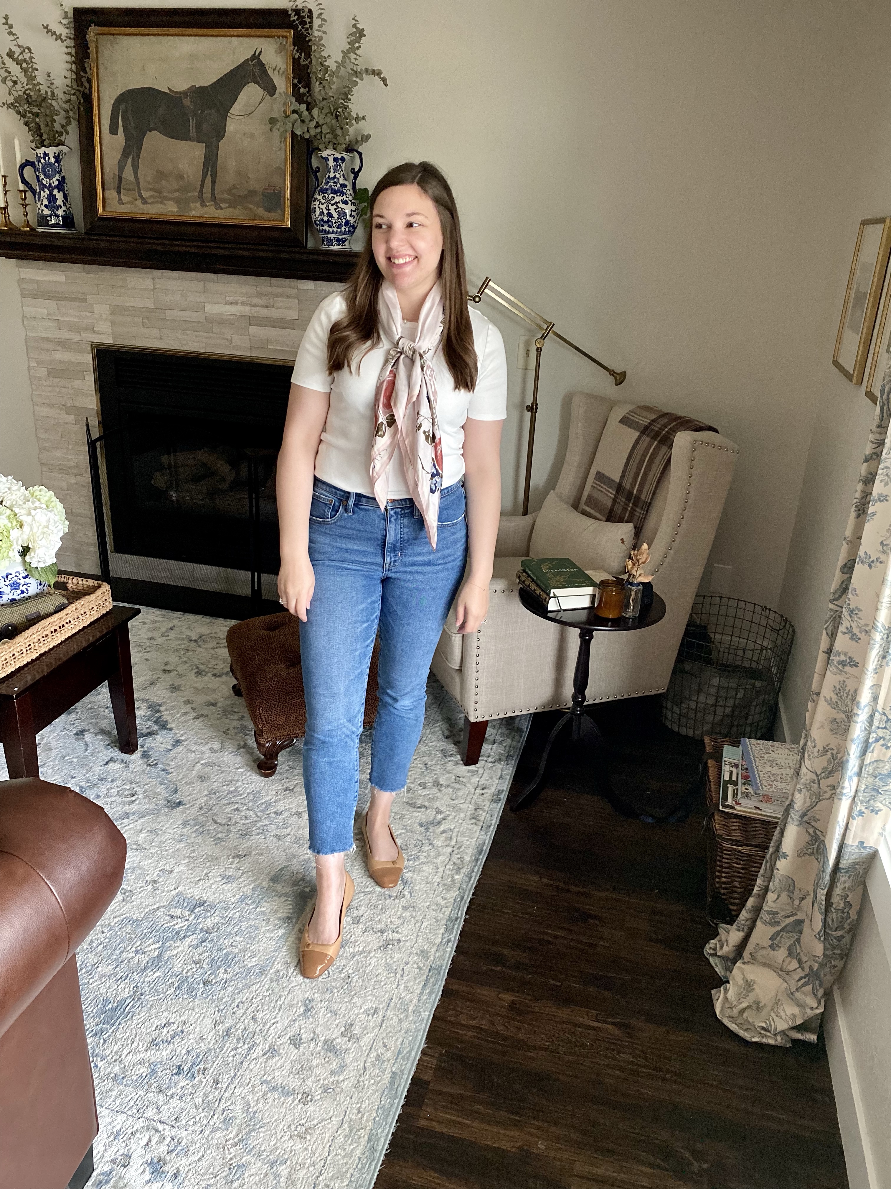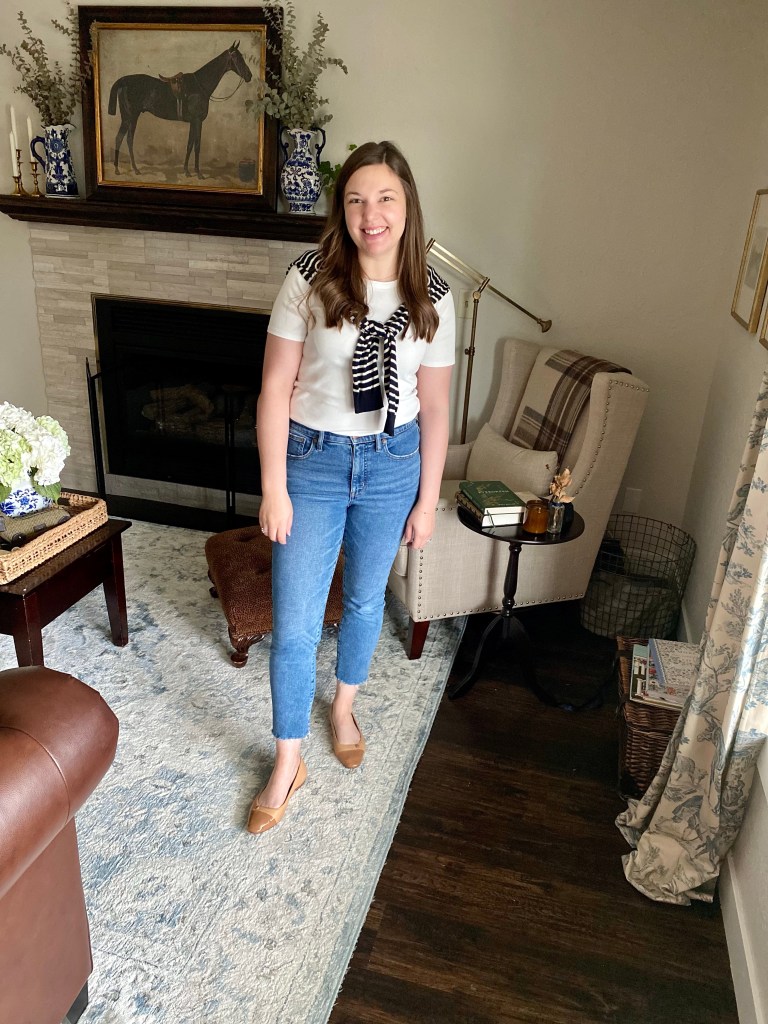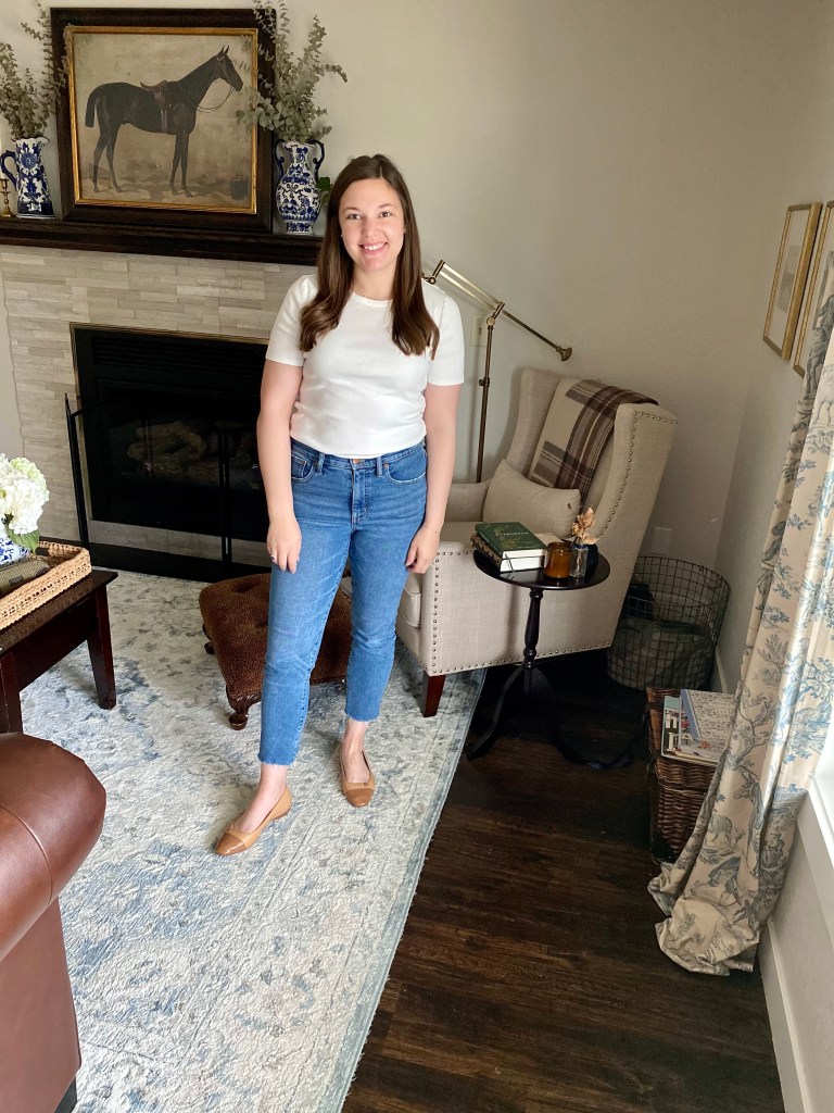 Start with your best fitting jeans, simple t-shirt and casual flats. I know some people hate wearing jeans but if you find a pair that is comfortable and fits you well it will make a HUGE difference. I’m wearing a pair from J.Crew Factory. They are my current favorite and I personally think my most flattering. They are a stiffer denim that doesn’t stretch too much throughout the day but without being too rigid. I like the casual medium wash and the raw hem allowing them to be a bit more casual.