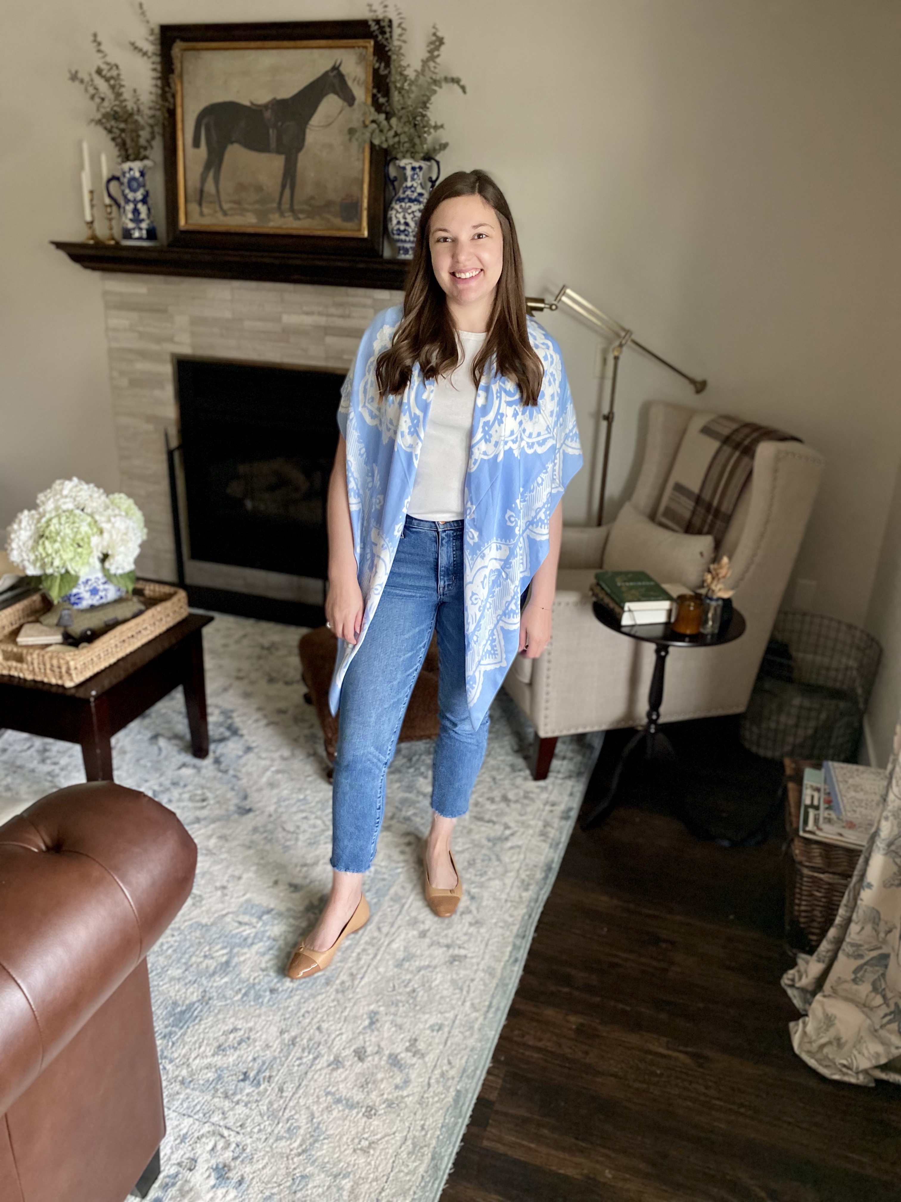 When adding a scarf, there are so many options for how to style it. On the left below is another way to wear a medium square scarf (standard size is usually about 34″) or you can go for a larger square scarf and wear it as more of a wrap. You can shop a current round up of scarves here.