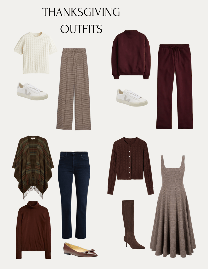 Cozy Casual: If sweats are more your vibe for cooking and enjoying your Thanksgiving meal then I love these autumnal colored sweatpants and matching top! If you want something a little more luxe I also really love these cashmere pants and sweater. If you want to elevate it just a little you could wear a white button down under neath to give it a slightly more sophisticated touch.